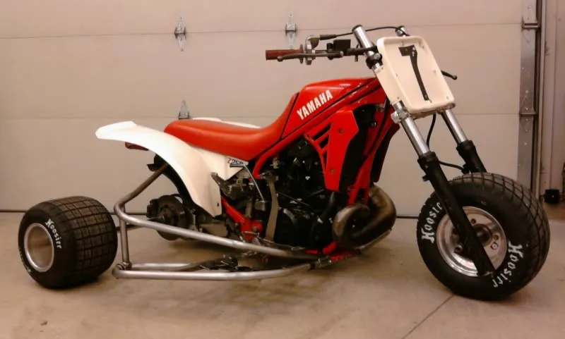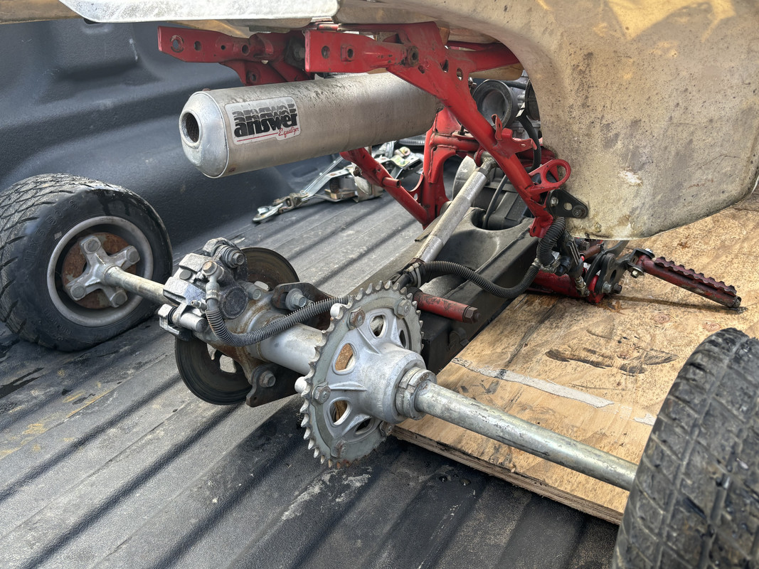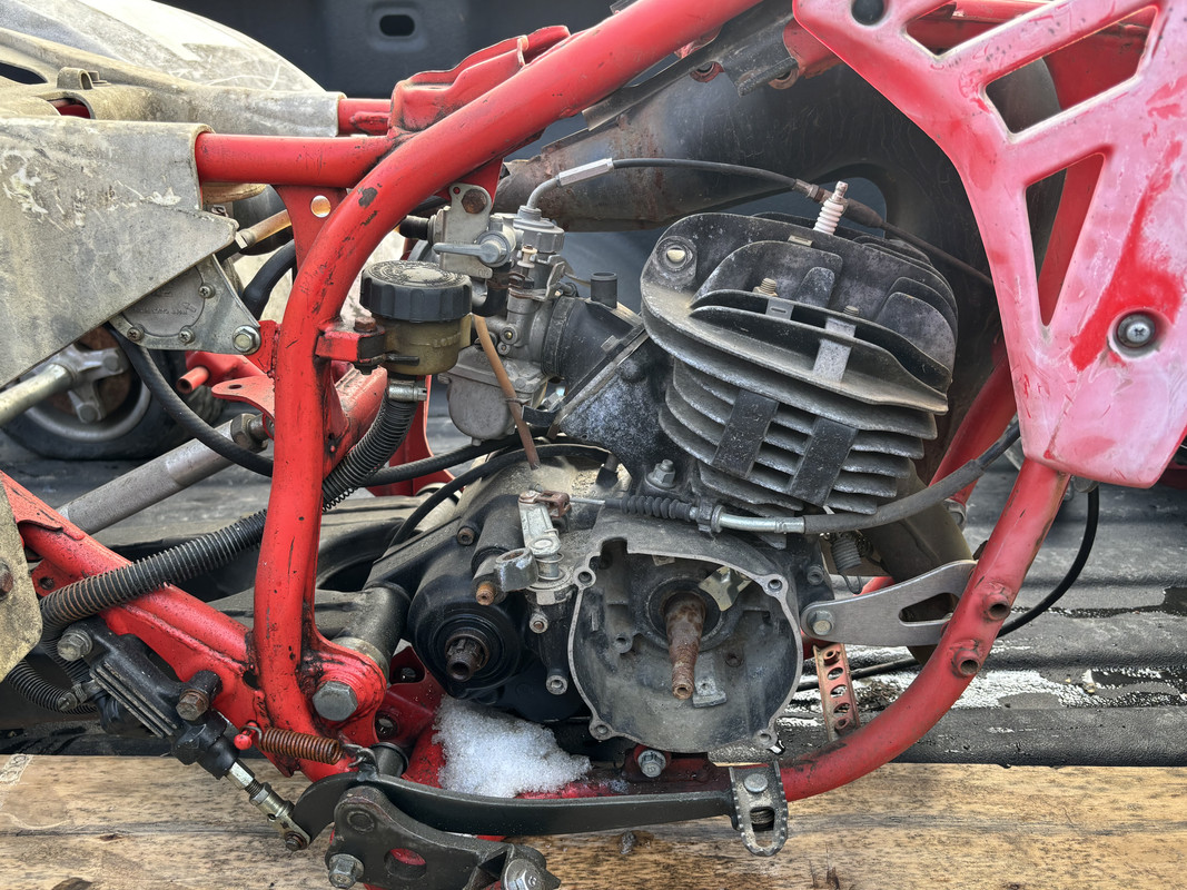 So I just got back home from picking this thing up, and I think I SCORED. From what I was told by the seller and from looking it over briefly, it’s a 1985 Yamaha Tri-Z 250 Limited Edition that was converted into a 200cc flat track racer, and apparently was even a championship bike back in the day. I was told it was raced in Anchorage, which would have likely been in the Sullivan Arena. It’s been converted to an air cooled Yamaha motor, which they did a very clean job installing, and from my limited research appears to be an ‘84-‘86 Yamaha IT200 engine. It’s very light weight, has an Answer Racing silencer, flat track handlebars, forks lowered 1”, solid rear shock, and runs an 11x6” tire on the left rear and a 12x6” tire on the right rear with a very custom hub/spacer/rim setup. It appears to have a wide axle, but I’m not familiar enough with Z’s to positively identify. The RH side foot peg is also custom. It’s missing the seat, tank, and LH shroud assembly, as well as the stator, flywheel, and all electronics for the engine. Appears to be otherwise complete. The engine is seized, but appears to be crank only and I have it soaking in ATF. The seller gave me a lead on someone who may have some history and information on it, so I’ve tried reaching out to them. If I find any other information or history, I’ll post it up. Best part, I snagged the whole thing for $100!