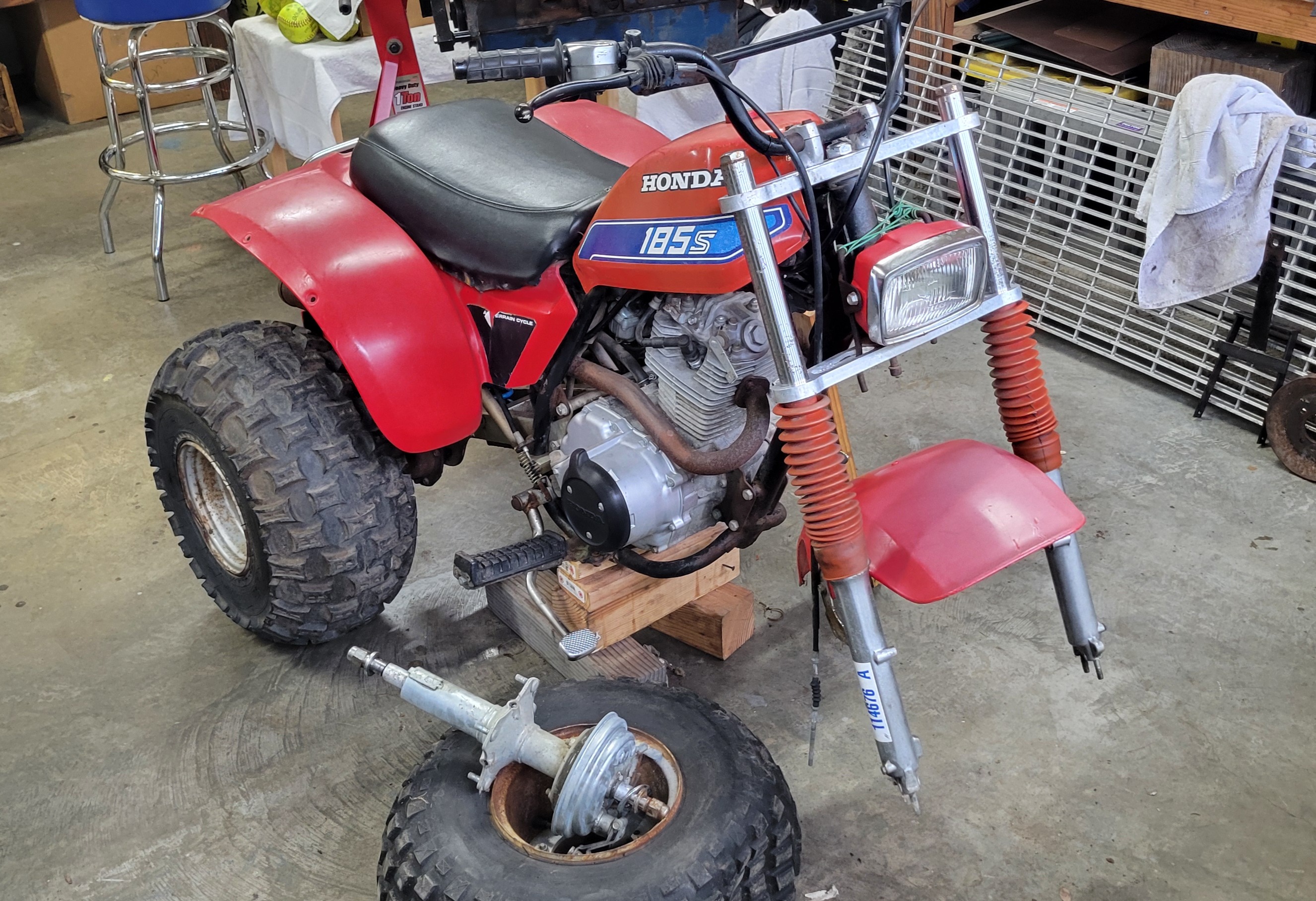 I am new to the site, so this is my official introduction. I have owned a trike when I was a kid (in the 90s), which was a 1982 Kawasaki KLT 250. TBH, that thing was a POS. Once I joined the Navy, I moved on to four wheels with numerous ATVs over the years. Here recently, I purchased my first Honda and it's an 185S that has been slightly modified. Some of you might like it, some may not. I dig it very much. It does have some minor issues, though. The only major issue is the rusted gas tank that leaks fuel faster than I can put it in. JB Weld to the rescue until I can find a replacement. I plan to start a build thread with lots of pictures, and I welcome questions and comments as I will most likely have questions myself. Here's a pic to get started (if I have permission to post a picture).