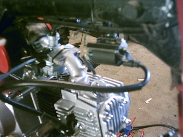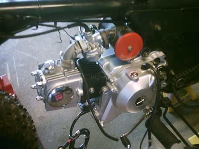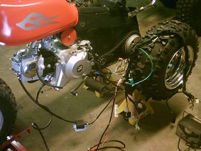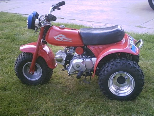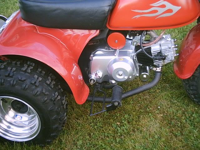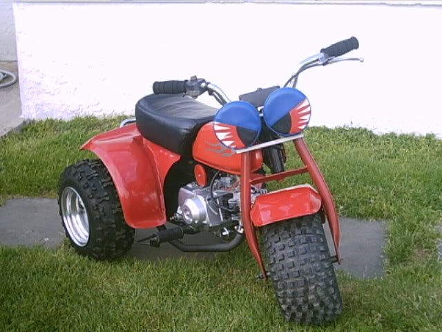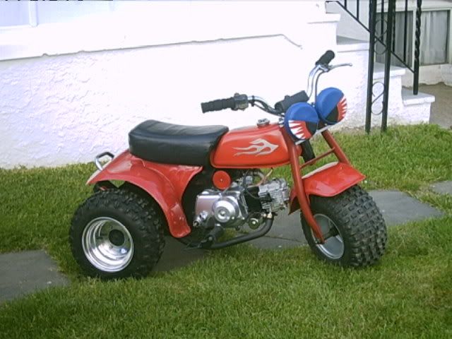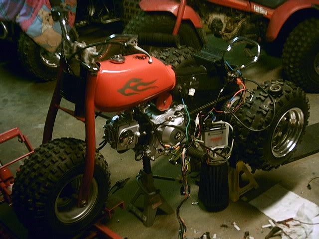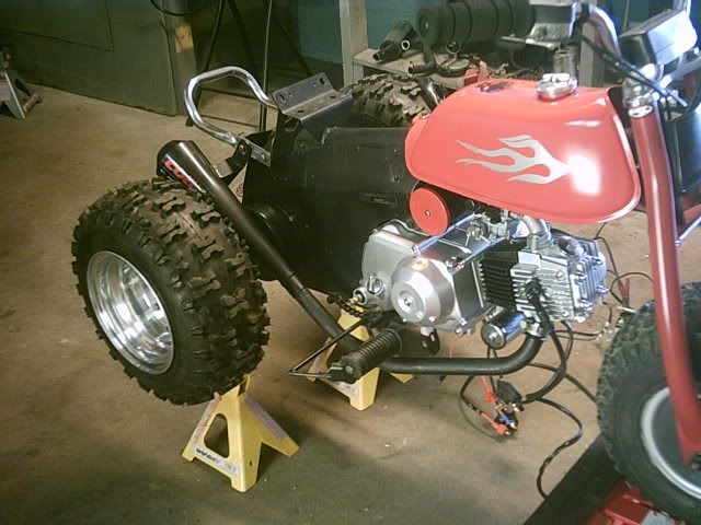 Not fully done yet i have to finish making my battery box and tucking away a few wires,has the copy of a 90cc honda racing motor all chromed outcobra exhuast and douglas alum wheels,and my banshee headlights with the eye covers i think they look wild, i had to make up my own brackets and weld um toghter for it