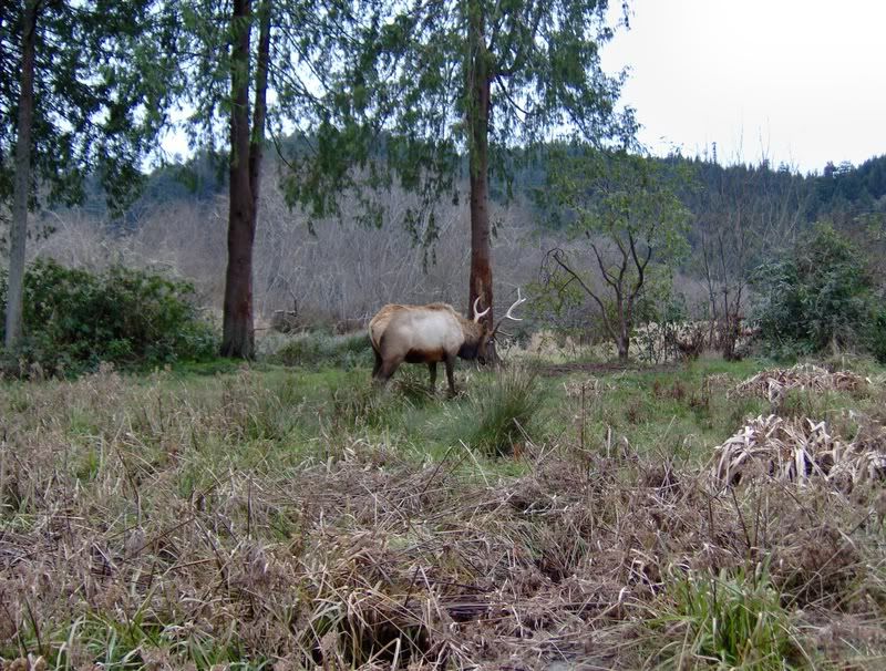 the elks were grazin in the fields beside route 1,in california.i simply pulled over,and snapped a few pics of em.they really like pretzels!!!there must have been 7-8 elk in a group in this field.i never got outta the car,but was close enoguh to throw them pretzels,it was very cool.