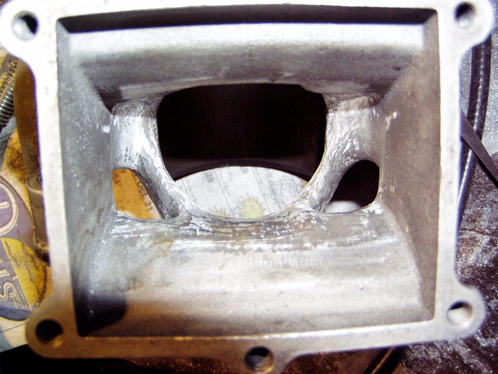 Those bottom little ports are called Boyesen ports. Originally, they were in a whole separate chamber from the transfer tunnels. Normally, the way those are made is they flow into the bottom of the crankcase, and also connect to the transfer tunnels. The stock 500 had a good set up, keeping them separated because normally when they are connected you have adverse flow conditions. Think about it, the boyesens are flowing downwards, and the transfer tunnels are flowing upwards. They are working against themselves. The problem with how mine was originally, is that the boyesen ports were so small, they were about useless. I enlarged the outlet, and DID make it connect to where the transfer tunnels open. What I did do though, is you see in the intake at the top of where those ports start, its ramped down in such a way where the flow is not so much as going into the transfer tunnels cross wise, but going downwards, parallel next to it and not necessarily flowing directly into it. Know what I mean?