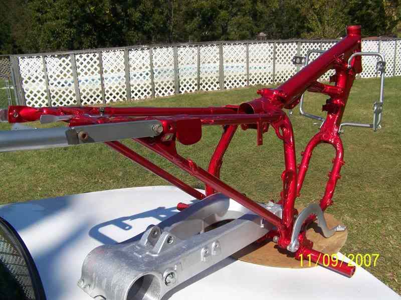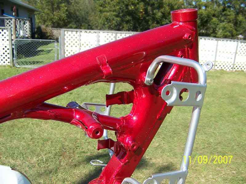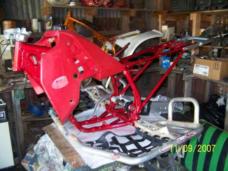 well I finaly started the assymbly of some of my partsof my flat tracker (not racing any longer) for the 08 season, first off the frame is 2 inches longer to better suit my ginormous size its painted in House Of Kolor candy apple tangerine with tons of HOK red micro flake and HOK red Ice pearl, also are a few peices that I had pc'ed chrome from FULL SPECTRUM POWDER COATING (dreadhed) also is the trx 450R swinger I will be using since this is the early model it is -1, also I set my oem short track tank I picked up for a song while back on there, I wil be reusing my black frnt fender and rear fender, but will redo all the stickers with new ones, yet to be finished is my motor wich will be done in the next 2 weeks. still have a ways to go, but its started now!!