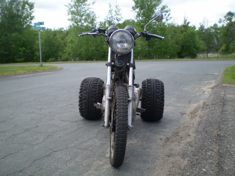 One is a 1982 Yamaha maxim 400 that i picked up for 150 bucks with pretty low miles for a bike,it wasnt running,so i cleaned the carbs real extensivly and she fired right up.I bought the bike with intentions of using the engine for my golf cart,but it was just to nice of a bike to wreck so i came up with this idea of taking off the rear wheel and welding an old atc axel on the rear end.Well i did that and it sure was worth it.The axel had a few more teeth than the stock sprocket so this thing had alot of torque,would do wheelies all day long.But,sadly,i was mudding in a swamp with it and i revved it up a little to high(about 10,000) rpm,dropped the clutch,and broke the 1st gear into pieces.I recently found a gear set on ebay and bought that and im gunna try and get this old beast goin again.I have had it up to 71 mph doin a dirt road and i could have gone more but it was gettin really squirrelly sliding all over so i slowed down lol.