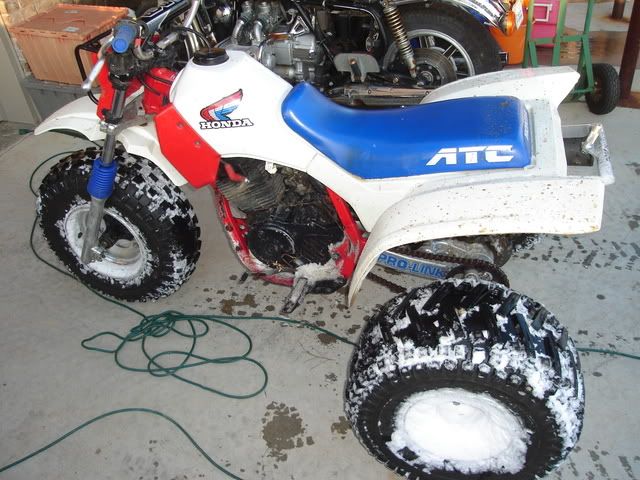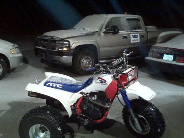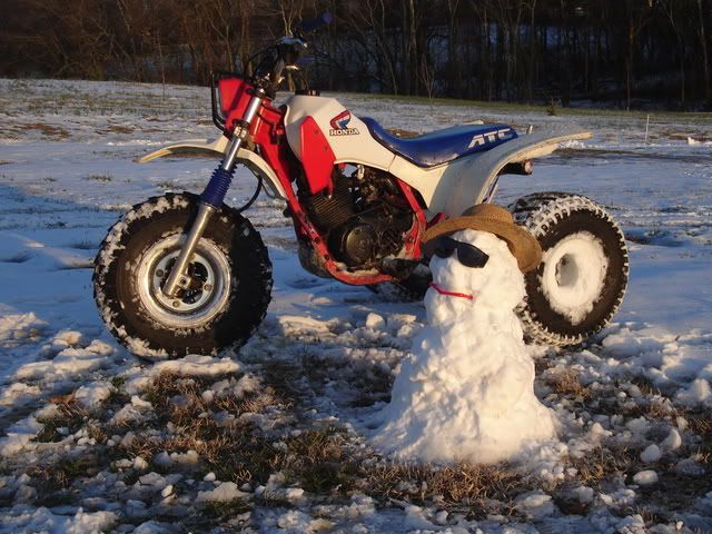 Well, it started snowing this evening and we MIGHT get 3" but I got the 200X out and had some fun. I clamped the digital camera(does MPEGS) to the left grip and tried practicing drifting flat track style...the bars were pointed somewhat straight but the ass end was drifting back and forth...I even tried doing a sliding 360 and had it perfected and then got balsy and flipped the goddam trike when I hit a bare patch that I had already scraped clean. Didn't dirt the bike bad, broke the clutch lever stand(Thanks god, it was a cheap EMGO) and bent the front brake lever.....BUT no cracked plastic or skinned seat cover......and I didn't get hurt...![]()