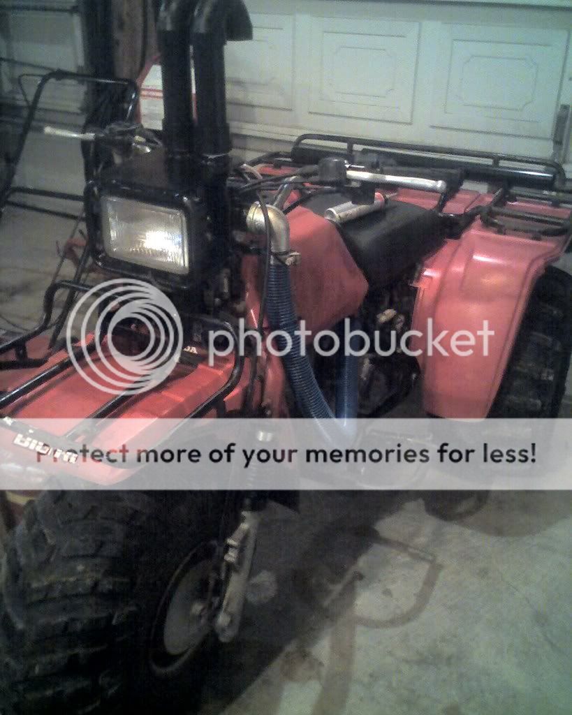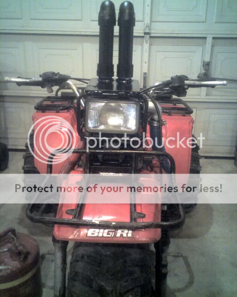 The pictures don't do much justice. I welded the 2 nipples in 2 holes i cut in the plate. I then welded that plate to my headlight cage. to one snorkel i ran all my ventlines. To the other nipple. I welgeg a 1.25" street elbow and threaded the other elbow into it. The pool hose slipped over the threaded end of the elbow. The hose just happens to fit snuggly in the airbox. Some rtv to seal everything up and its done deal. Be sure to run ALL your vent lines. Carb, crank case, gas tank, rear end, brakes. Its worth it. I'm tired of getting water in my oil. This fixed it. Any questions are welcome