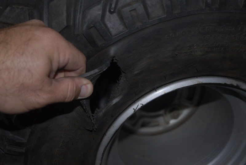 The front tire snapped a piece of log out at just the right spot so the rest of the log catches the lip of the rim and DRIVES the #$%^&* thing right through the sidewall, and I mean THROUGH the sidewall! Look down and see my AWESOME new trike that spent the last 15 years in a garage and has less than 400 km on it with a destroyed tire!!!!![]()