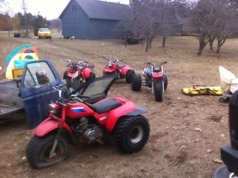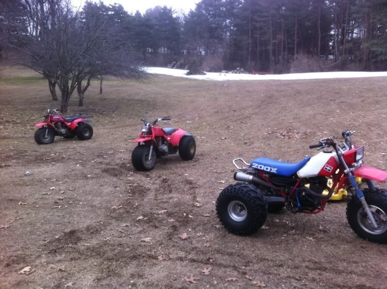 Took my 350X for a ride yesterday. Today, got both the 200s's running and rode them around my buddies yard a bit. Pulled all 5 trikes, and golf cart/quad abomination, and a bunch of other stuff outta my buddies barn, so we could reorganize. With organisation we have 5 trikes, 2 snowmobiles, an F450, and the golfcart/quad abomination, we figure we have room for at least 3-5 new three wheelers