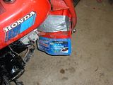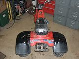 Took old girl out and whooped some a@# in the mud, got more on me than it with wide rear's though? Solved that with 12 pack and a old set of 70 fenders cracked up. Just sawed off and riveted to original fenders! Added old stock 185s mudflap to make sure, crooked with character!! Got me a folger's front fender, plastic coffee can cut..... works great and flexes........ this thing is going to trikefest, this is what it is all about..... check out the pics....... kinda looks like a Polaris Predator fender.........![]()