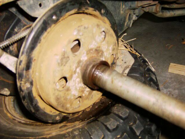 the axle out, used a gallon of PB blaster. Nothing's working! I read where some of you mentioned that there would be an o-ring that may be stuck on.....i'm not sure where it should be. I took off the two large brake drum nuts, and there was like a washer behind them. Is that the o-ring everyone's talking about? Here's a couple of pics of what i'm down to..... am i missing something? It's time to walk away for a while before i get pissed and ruin something!